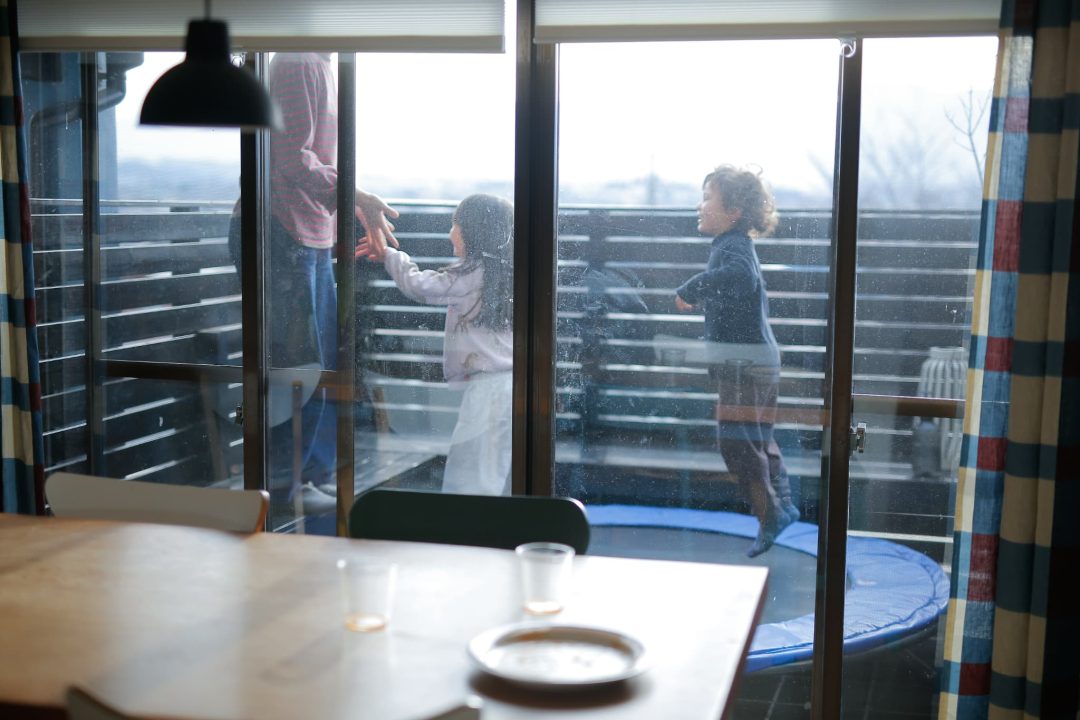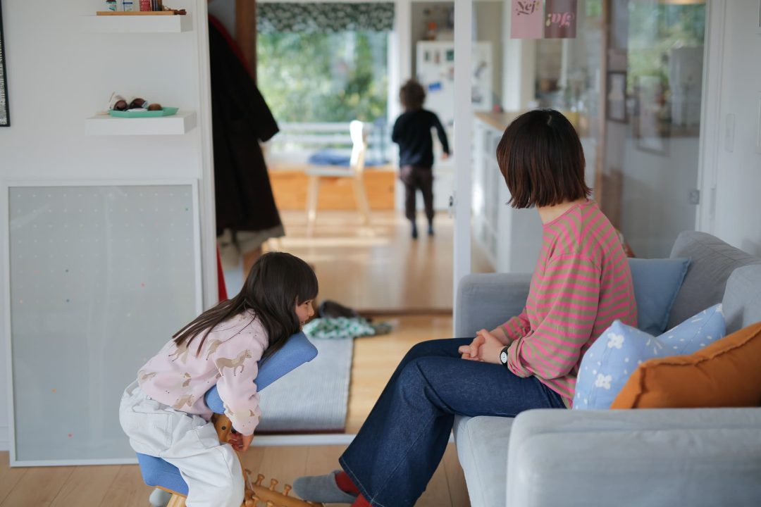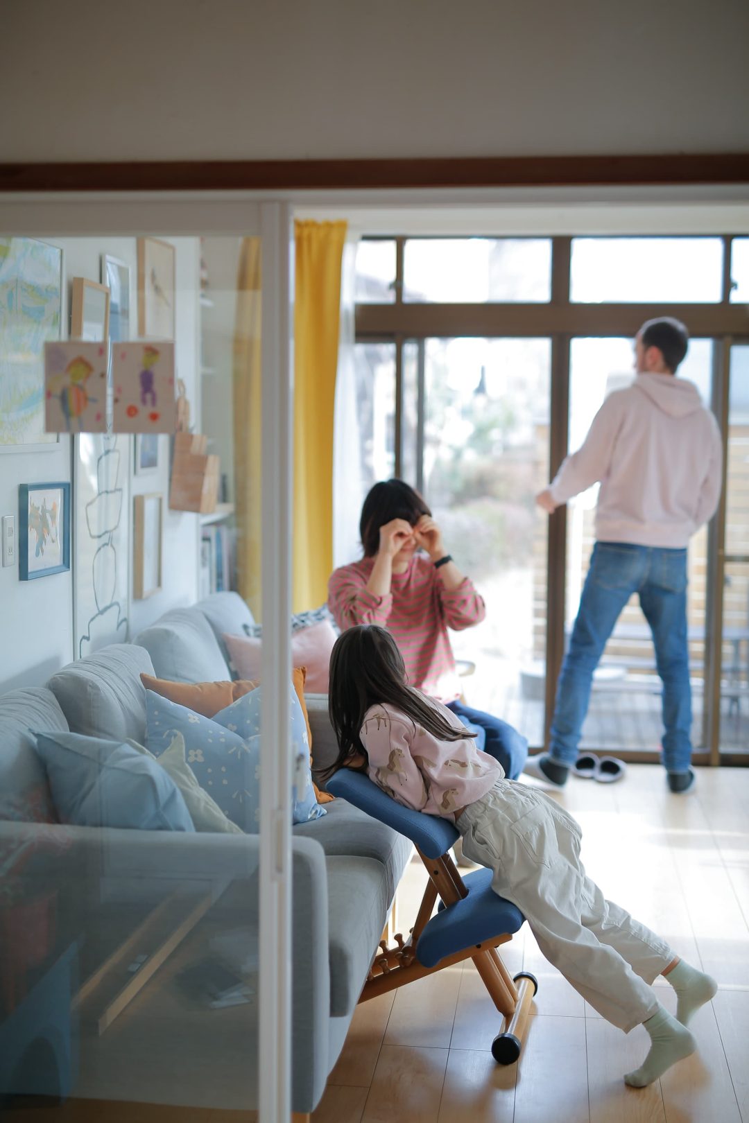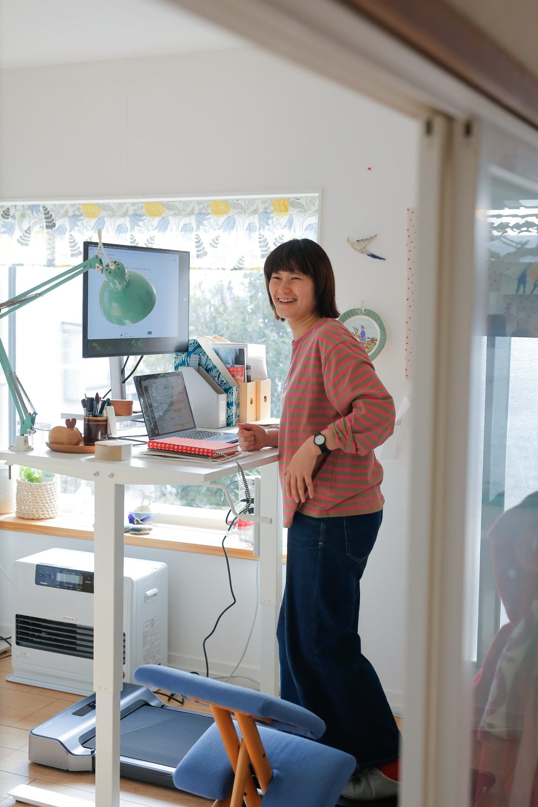 子どもたちの弾むような声とともに、家の空気が一瞬で変わります。さっきまで並んで働いていた6畳のオフィスには、夕方の光がゆっくり差し込んでいます。