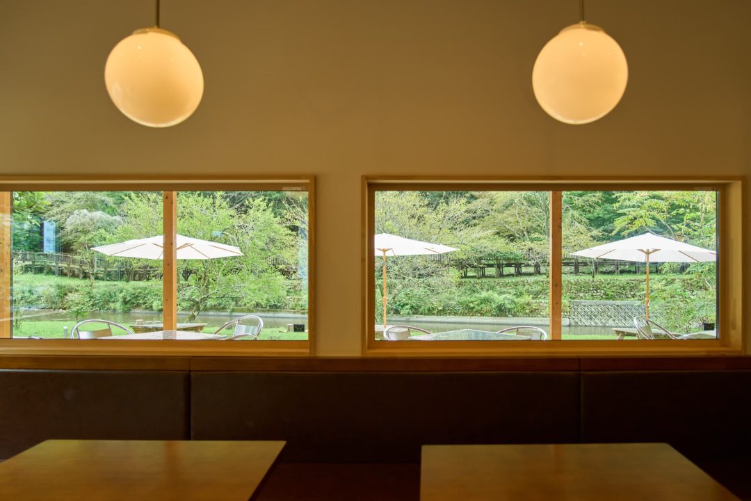 店内に入るとまず目に飛び込んでくるのは、壁一面の窓と、その向こうに広がる風景。陽光に輝く芝生のテラスの先には清流が、その対岸には深緑の森が見える。「店の中からも、この景色を楽しんでほしいと思って大きな窓にしました」と笑顔で話す店主。春は薄紅色の梅と川沿いに咲き誇る桜が共演し、夏から初秋にかけては森の緑が鮮やか。冬はデッキや芝生にうっすらと霜が降り、凛とした空気の中で幻想的な風景が楽しめる。「寒い冬でもテラスでゆっくりと過ごしていただけるよう、焚き火を2台置いて、時には焼きマシュマロや餅つきなどのイベントも行います」。そんな話を聞くと、静岡市内だけではなく浜松や沼津、遠くは名古屋方面からも定期的に訪れる人がいるのも納得だ。