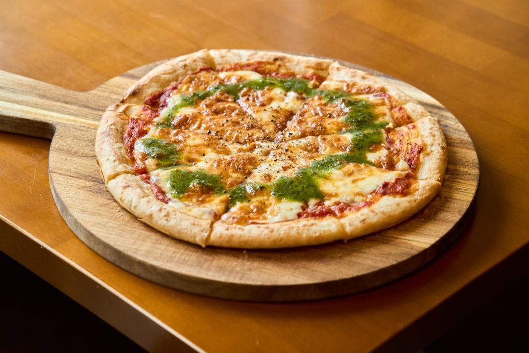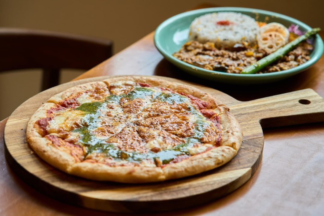 ランチはピザやカレーが楽しめるとのことで、今回は2種類をオーダー。カリッとした生地のマルゲリータピザは、マイルドで濃厚なトマトソースや香り豊かなバジルソースにチーズのコクが加わり、食べごたえ満点。またガラムマサラやクミンなどのスパイスを独自に調合し、豚ひき肉と野菜をたっぷりと使用したドライカレーも人気メニュー。スパイシーな芳香と辛味が口の中にふわっと広がり、後から野菜の甘味や肉の旨味がじんわりと感じられ、香ばしい雑穀米との相性も抜群だ。