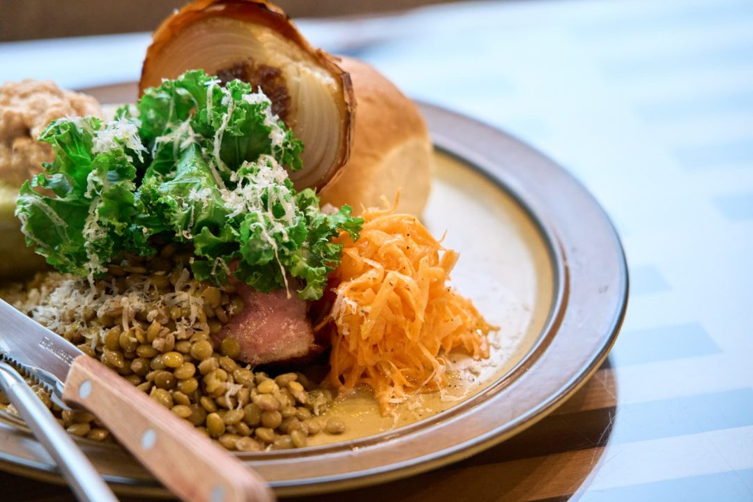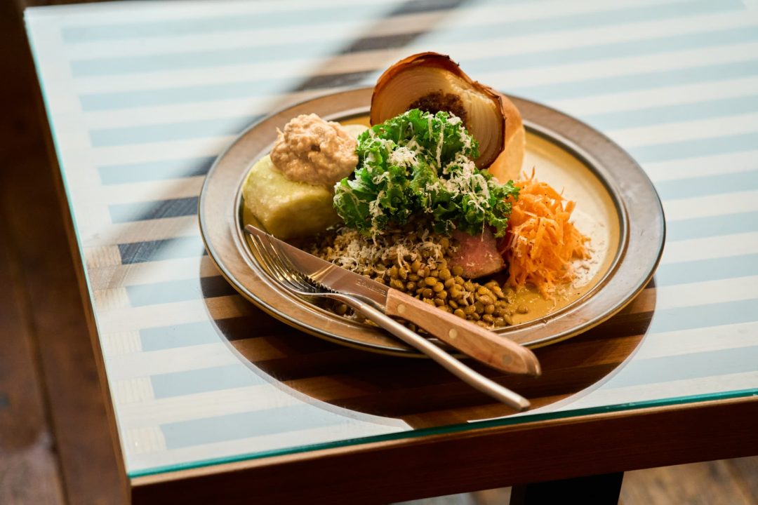 さっそく、定番のデリプレートランチをオーダー。テーブルに届いたのは、彩り豊かな野菜がたっぷり盛られた一皿だ。炙ることで苦味を抑えたケールの下には、ハーブとニンニクでシンプルにマリネした肉厚なローストポーク。低温調理でしっとりした食感に仕上げ、噛むほどに肉の甘味が感じられる。サイドメニューには爽やかな酸味が食欲をそそるキャロットラペと、とろけるような甘さのローストオニオン。ここまでがスタンダードの料理で、さらに季節の食材を使った「あと 一品」が添えられる。この日はみずみずしいナスのフリッターで、マイルドなツナソースとの相性も抜群。