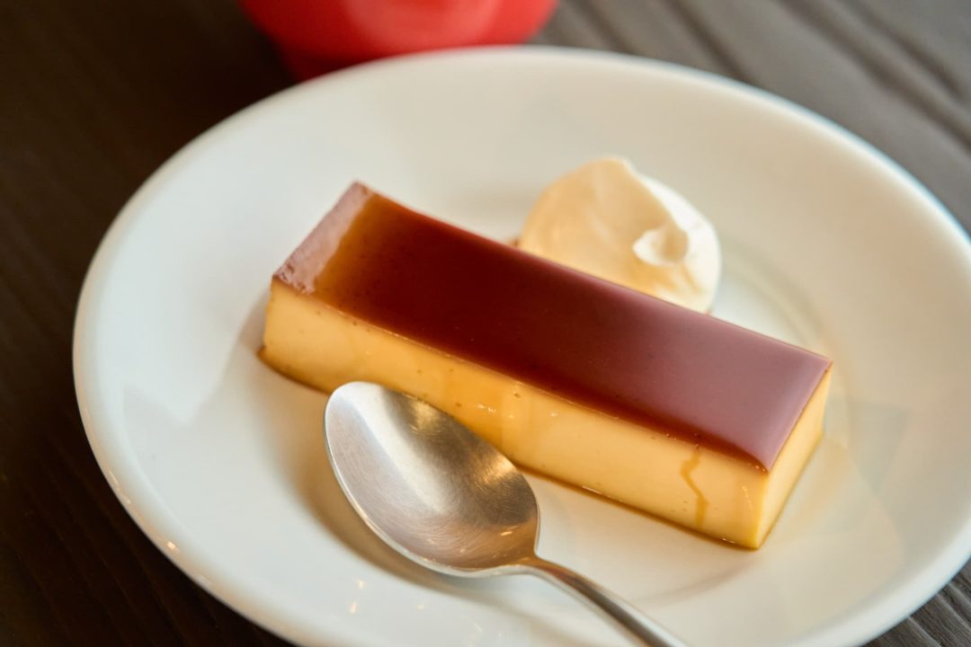 ランチでお腹がいっぱいになっても甘いものは別腹。店の人気スイーツ、ブラジルプリンを注文。練乳をたっぷりと入れて絶妙な火加減で蒸し上げたプリンは、かための食感ながら舌触りはなめらか。ミルキーでコクがあり、しっかりとした甘さを感じられる。店主がオリジナルでブレンドする深煎りのほろ苦いコーヒーとともに味わえば、満足感この上ない。