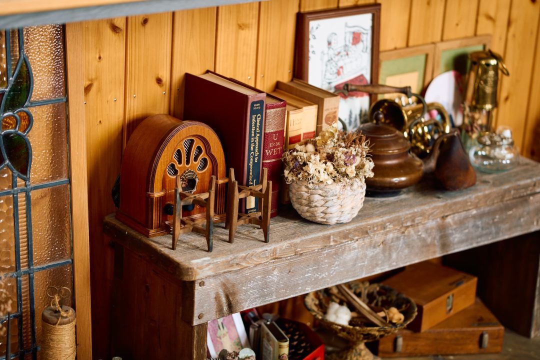 鈴鹿ICからほど近く、のどかな田園風景を眺めながら車を走らせると、やがて昭和の面影を残したビルが見えてくる。ここがカフェかと思わず迷ってしまう飾り気のないビル。しかし扉を開けると、アンティークや雑貨に囲まれた別世界が広がる。味わい深い木目のテーブル、どこか懐かしいミシン台、壁際を飾る雑貨類。レトロなラジオやカメラがあるかと思えば、小さな飾り棚にはミニチュアが並ぶ。どれもこれも愛らしくて、思わず見入ってしまうものばかりだ。「テーブルやイスはアンティークです。雑貨は私がもともと持っているものや好きなものを集めました。棚やカウンターは自分でDIYして少しずつ店の形を整えていきました」と穏やかな笑顔で話す店主。聞けば、このビルはもともと商工会議所で、その後地域の人たちが集まるコミュニティカフェとして利用されたが、縁あってこの場所を引き継ぐことになったそう。「現在は、私が1階でカフェを、娘夫婦が2階でカフェレストランを営んでいます」。最初は以前のカフェと同様にモーニングを提供していたが、徐々にコーヒーとスイーツ、焼き菓子の店にスタイルを変えていった。