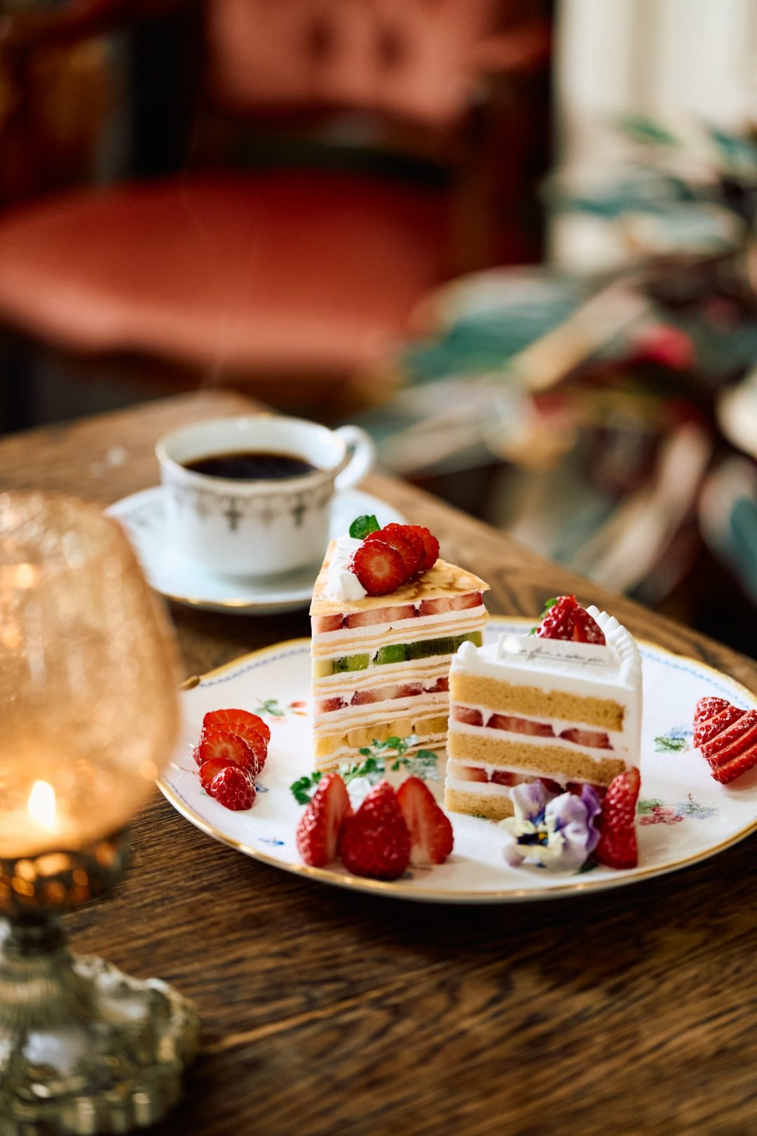 もともと手づくりすることが好きだった店主は、ケーキも独学でずっとつくり続けてきた。こだわりは「なるべく体に優しいものを使うこと」で、主に国産小麦やきび砂糖を使用する。この日頼んだのは、完熟イチゴを使ったショートケーキと、フルーツのミルクレープのプレート。イチゴは地元の農家から仕入れる朝採れのものを使用し、みずみずしく爽やかな甘酸っぱさが甘さ控えめのクリームやふんわりと焼き上げたスポンジともよく合う。イチゴのほかにキウイやバナナもたっぷりとはさんだミルクレープは、口の中でも層を織りなし、味わい豊か。イチゴを使うのは6月頃までだが、これからの季節は長野の農家から直接仕入れるぶどうや桃へと変わっていくというから何度訪れても楽しめる。