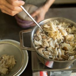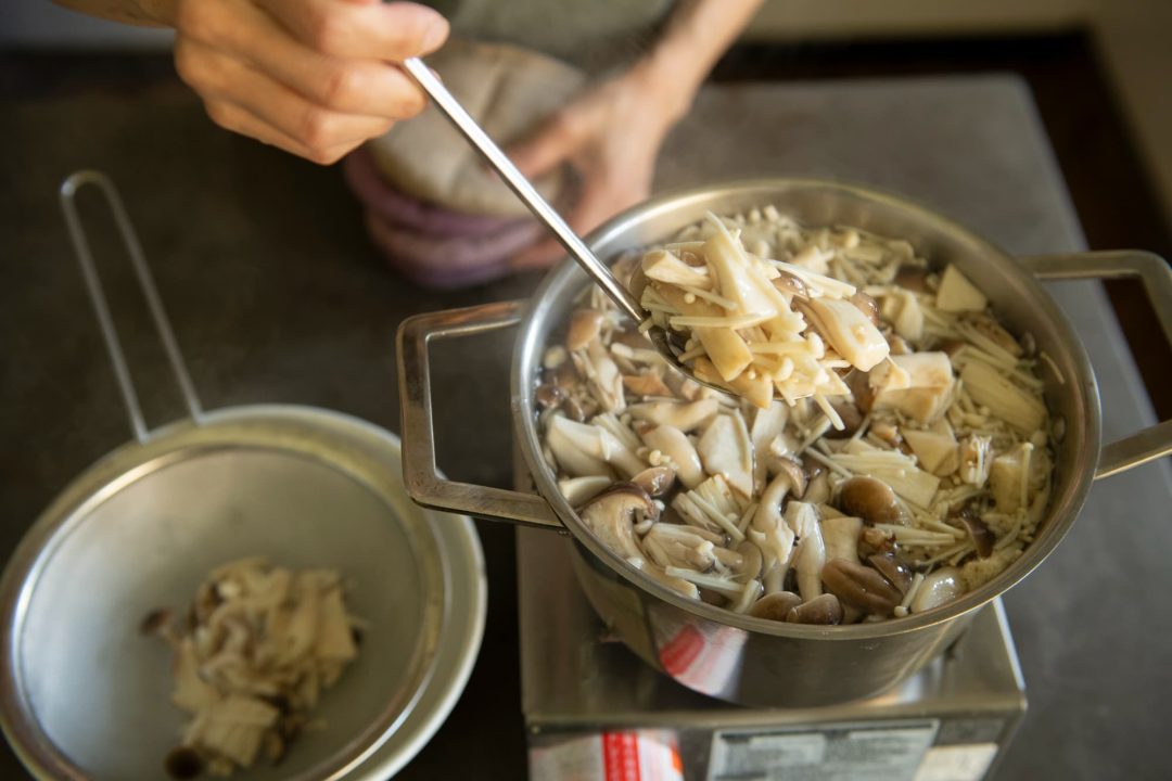 1回目は「塩きのこ」と「塩きのこごはん」。塩きのこは、茹でて塩をするだけ!きのこの旨味がお米にしみこんで、滋味深い味わいとなります。「きのこを茹でた汁は捨てずに、野菜や卵などを入れてスープにしましょう。きのこの旨味の深さに、きっと驚きますよ」とワタナベさんから美味しいアドバイスも!