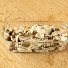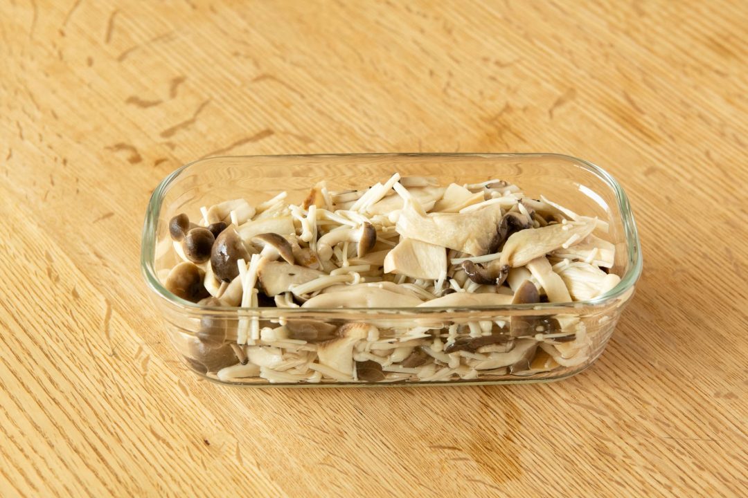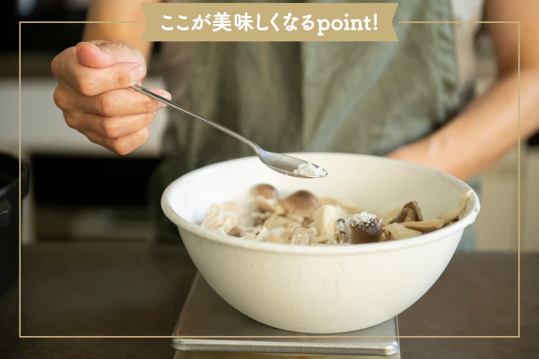 【Point】茹でたきのこに塩をする時は、必ず塩の分量(パーセンテージ)をきちんと計りましょう。そうすることで、どんな量でも毎回同じ塩分量でつくることができます。 - 冷めたら保存容器に入れて保存する。