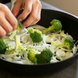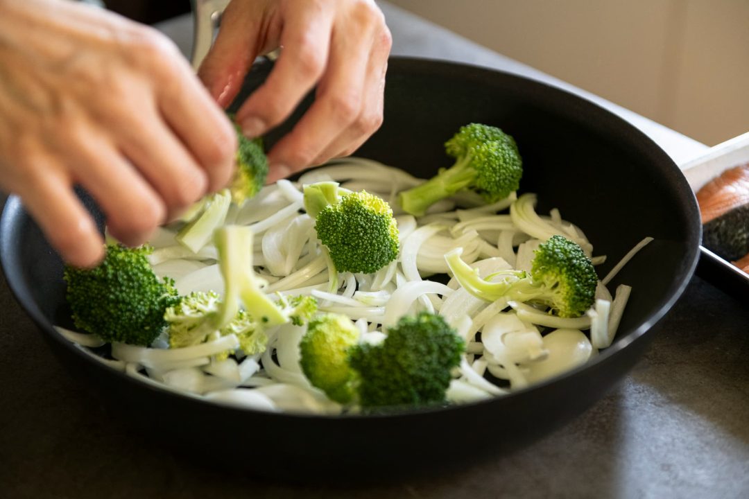 - ブロッコリーは小房にわけ、玉ねぎは縦薄切りにする。