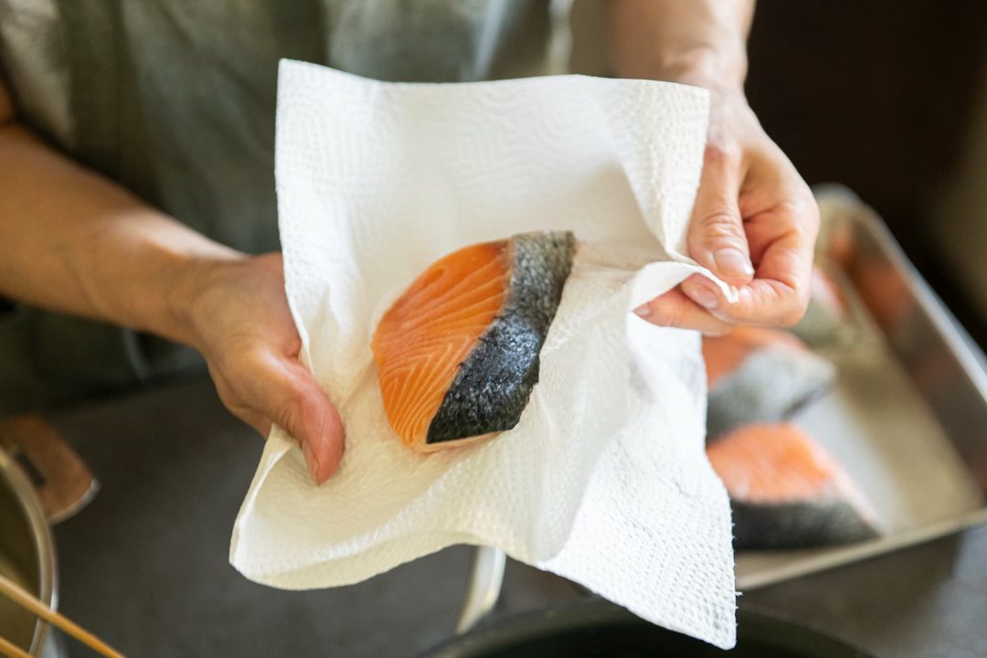 - 鮭はうろこをのぞき、塩を小さじ1/2をふり、10分おいて水気を拭く。
