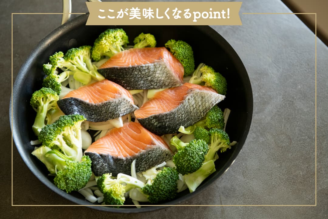 【Point!】鮭と野菜を一度に加熱するので、具材に均一に火が入るように、ブロッコリーは大きめにカットする。 - 全体に残りの塩小さじ1/2をふり、白ワイン、バターの半量、オリーブオイルをまわしかけたら蓋をして中火にかける。