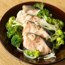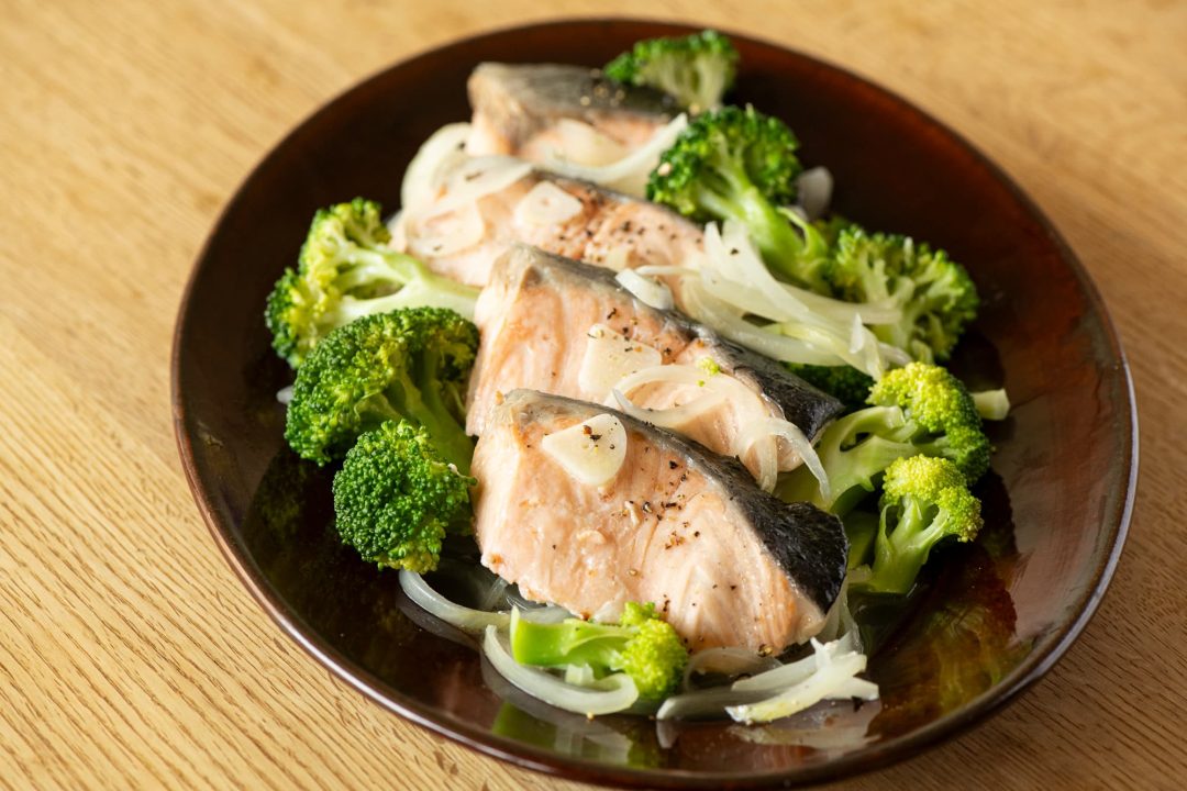 秋に旬を迎える鮭は乳製品との相性が良いので、蒸し料理としては珍しいバターを使ったレシピを考えてみました。あらかじめ塩をふった鮭にバターをのせて、野菜と一緒に蒸すだけ。最後の仕上げに、バターをもう一度のせれば風味アップ! コクと香ばしさが鮭の旨みを引き立ててくれます。このような油脂系を使う蒸し料理は、フライパンで作れば後片付けがしやすいですね。