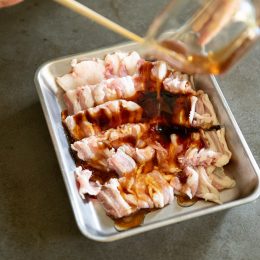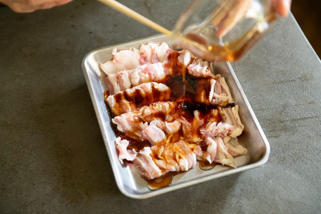 - 豚肉は3cm幅に切り、調味料Aをもみこむ。