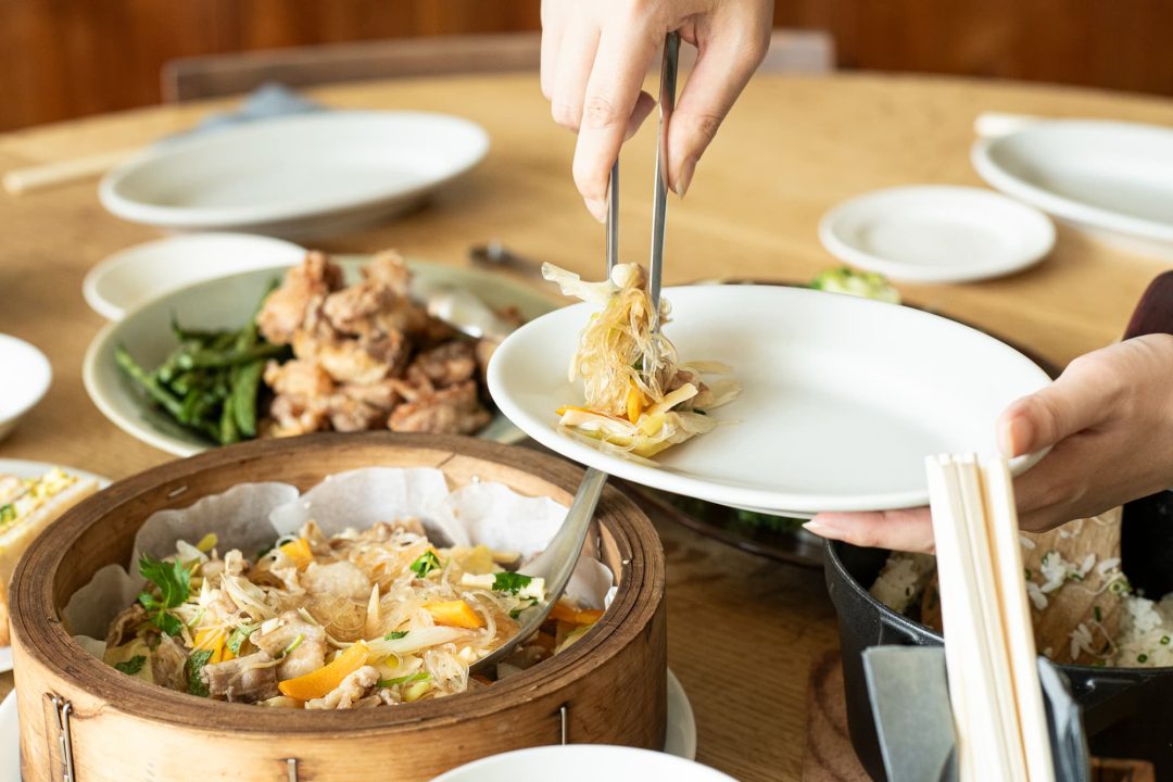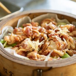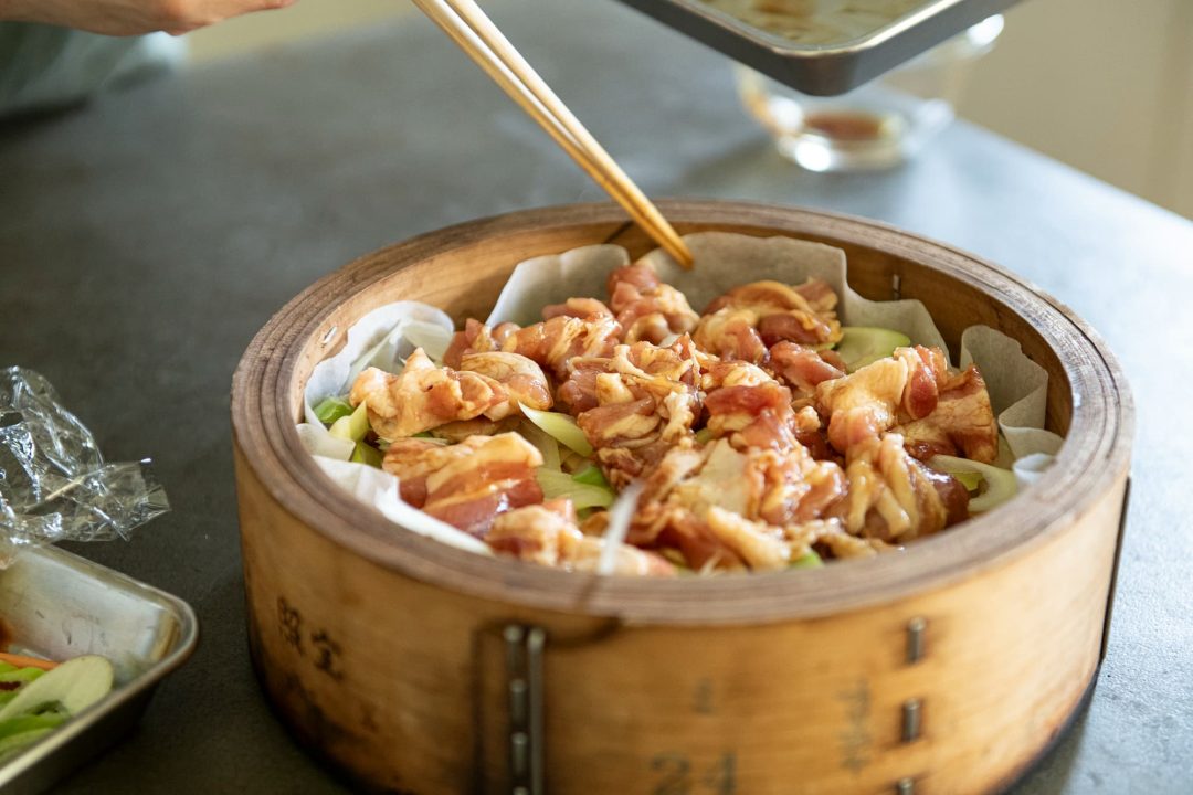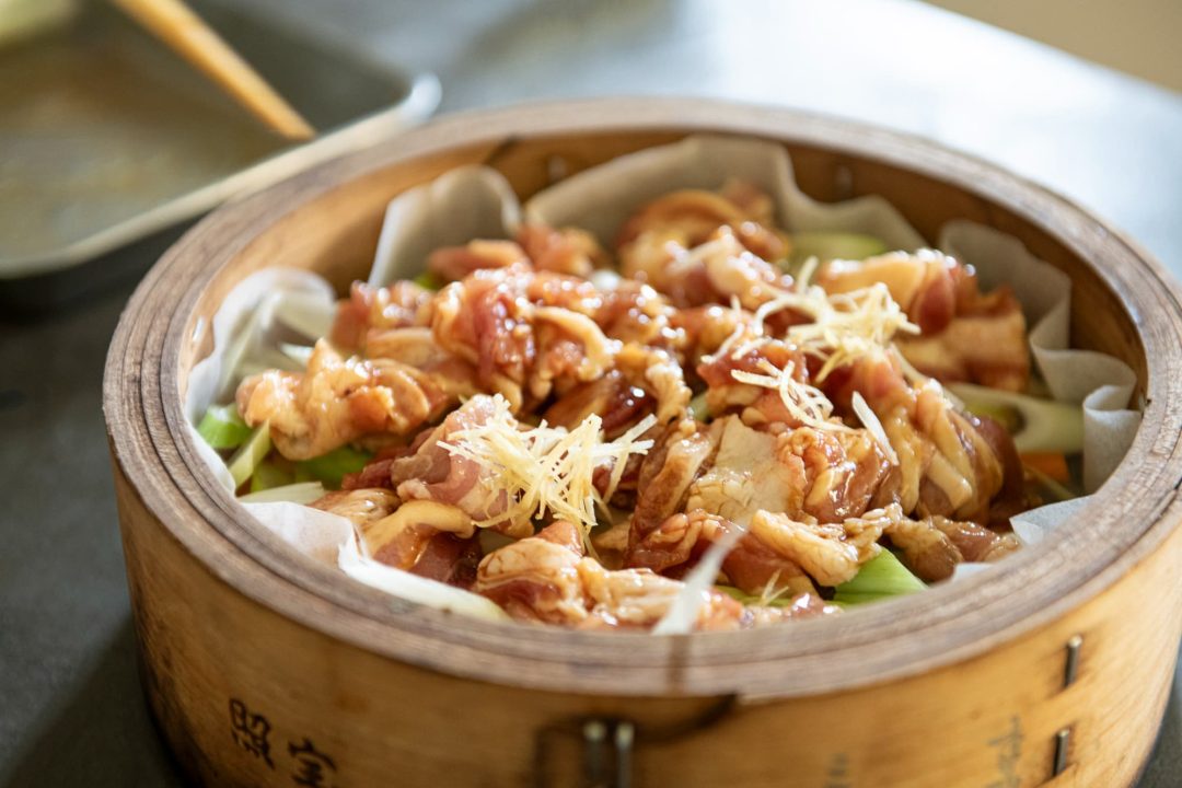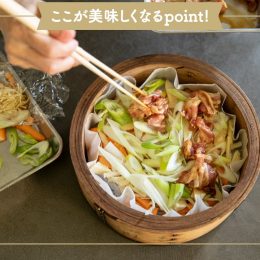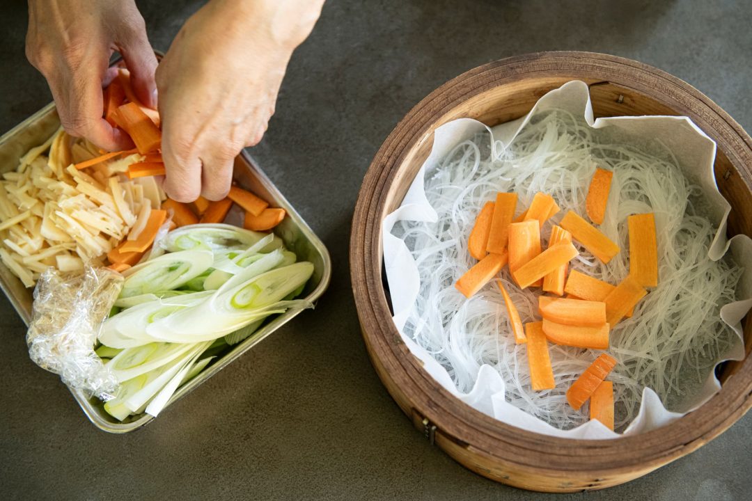 この料理は、下から順番に緑豆春雨・野菜・下味をつけた豚肉と重ねて蒸し上げます。そうすることで、肉の旨味は、野菜へ、春雨へと染みこんでいきます。旨味の強い食材を上に、野菜など味を染みこませたい食材を下にすることを覚えれば、あとは食材に火が通るまで蒸すだけ。このポイントを覚えれば、実は蒸し料理はとてもカンタンなのです。