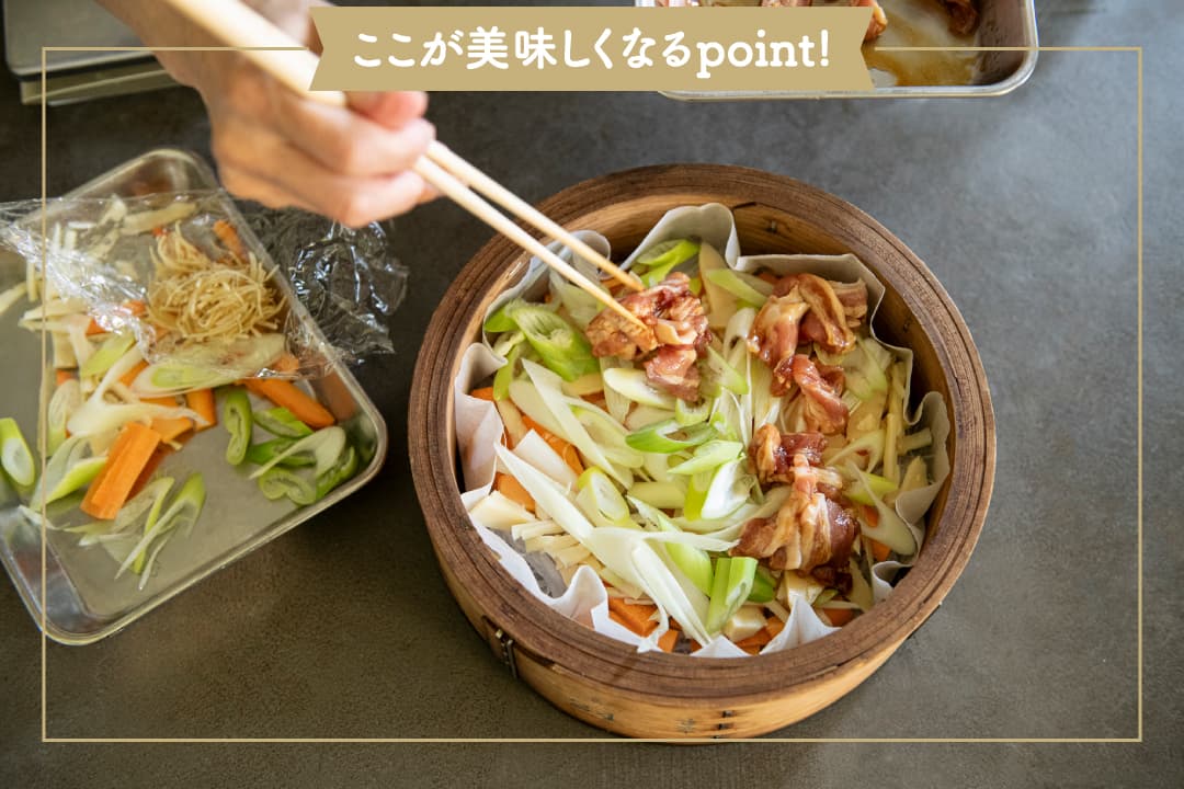 蒸し料理の基本は、魚や肉を野菜などの上にのせること。のせる順番を守れば、まず失敗がないのもよいところなのです。