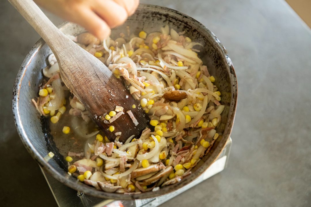 - ベーコンは細切り、マッシュルームは薄切りに、玉ねぎは縦薄切りにする