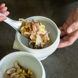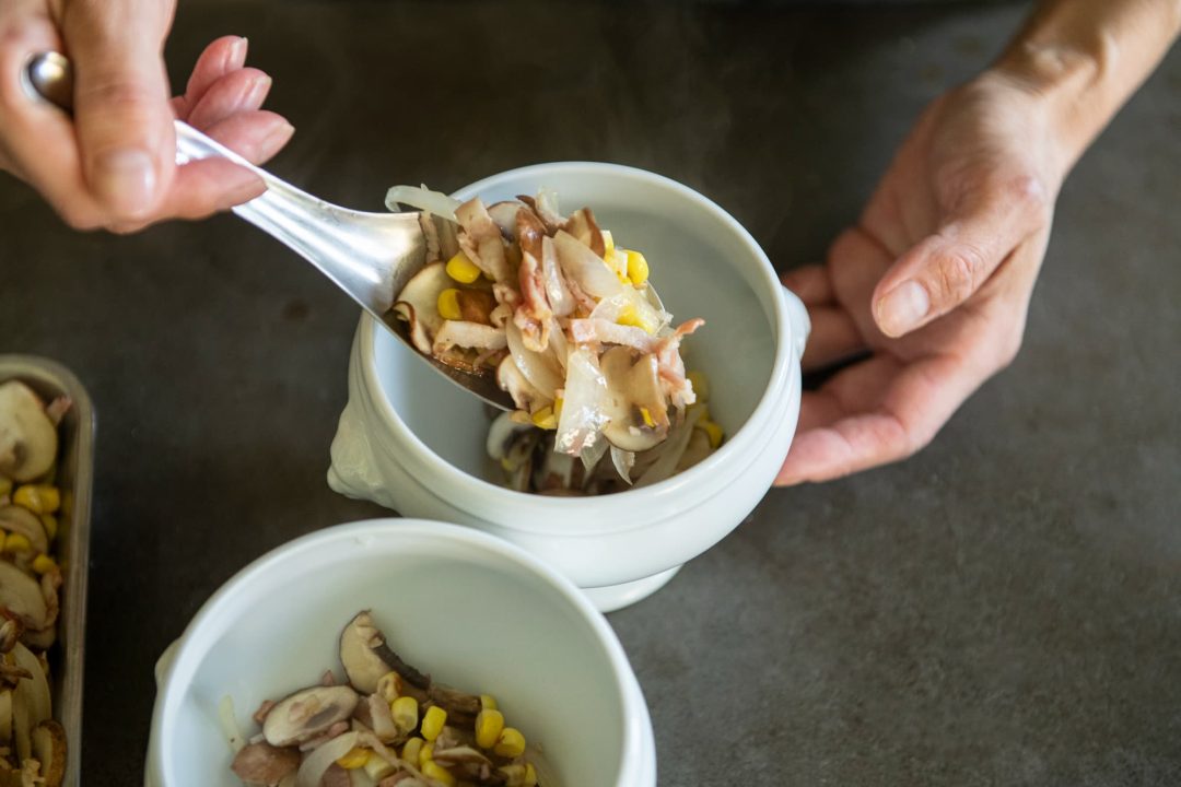 このメニューは、マッシュルーム・ベーコン・チーズ・卵・牛乳などを混ぜて蒸すのみ。量さえまちがえなければ失敗もしにくく、おもてなしの時などにぴったりです。