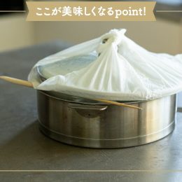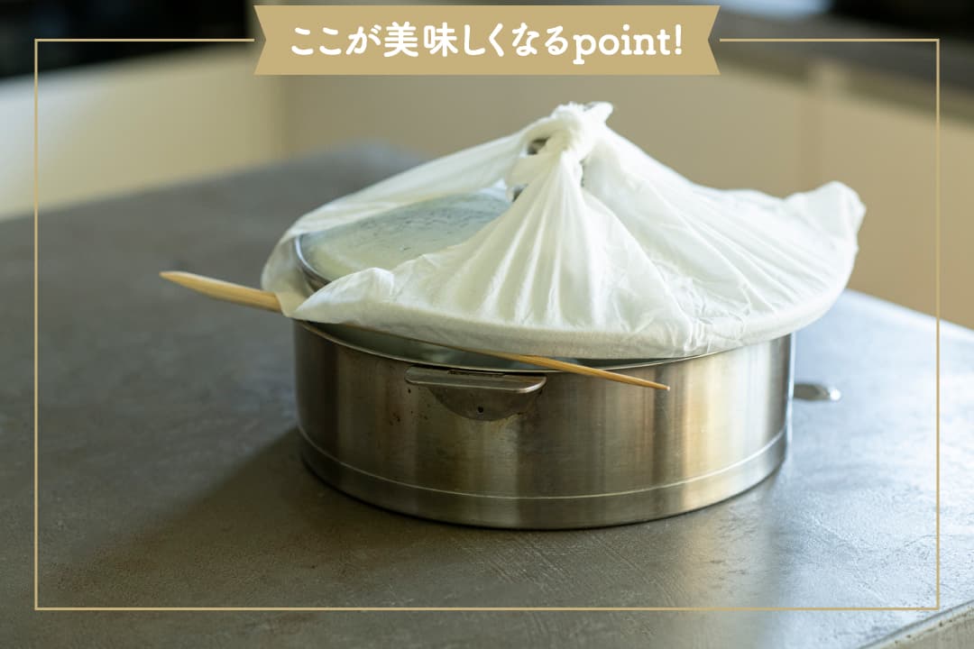 【Point!】蒸す時は、深鍋と蓋の間にお箸を挟んで蒸すと、「す」が入りにくい。ただし、せいろの場合は蒸気が逃げるので箸を挟む必要はない。