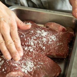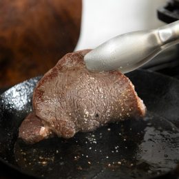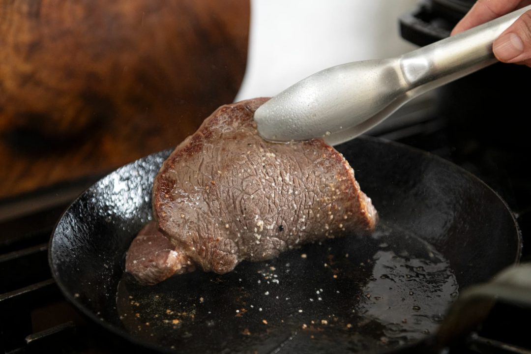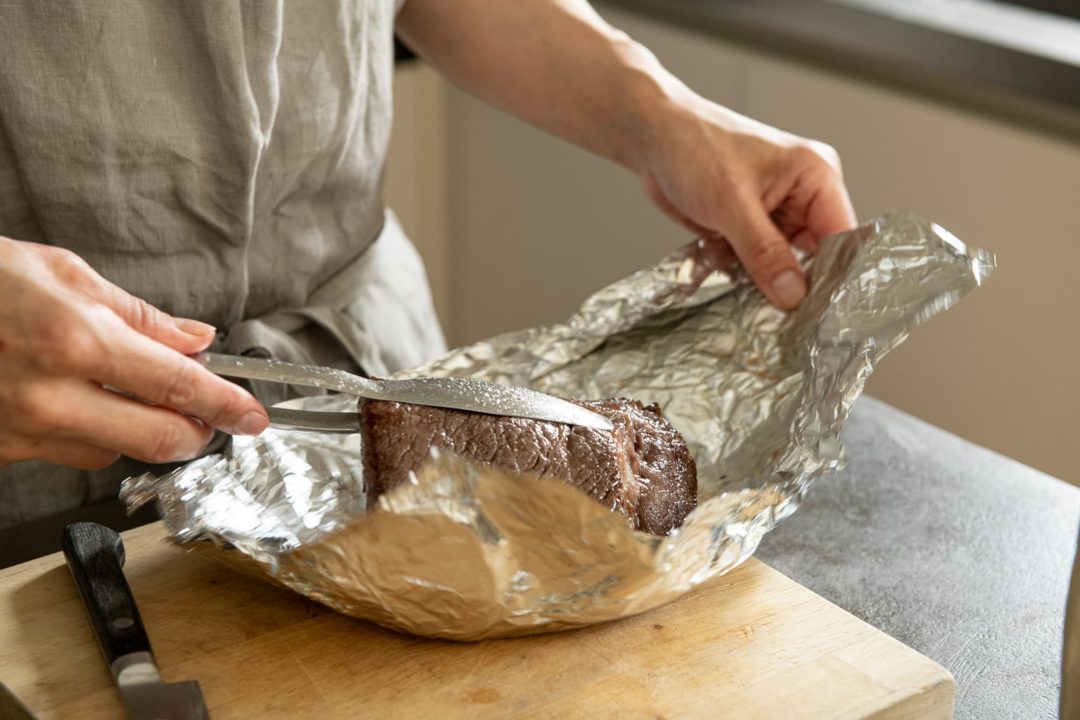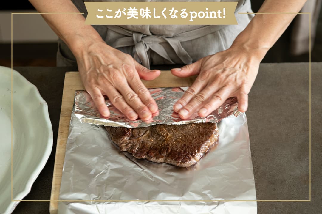 大事なポイントは2つあります。まずは、調理を始める前に牛肉を室温に戻しておくこと。もうひとつは、肉の両面にしっかりと焼き目をつけたら、アルミホイルに包んで保温をすることです。保温時間は、焼いた時間と同程度の分数と考えてください。こうすることで肉汁が流れ出さず、美味しさがギュッと詰まったステーキになります。もちろん、焼き加減や保温時間は好みがあるので、何度か試してみてくださいね。