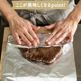 ※牛肉の厚さ=焼き時間が目安。今回は1㎝厚としたため、片面約1分ずつ焼いています - 2.をアルミホイルで包み、約5分おく。