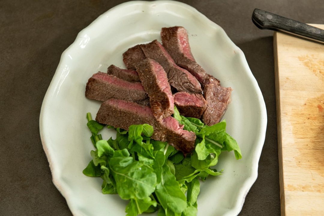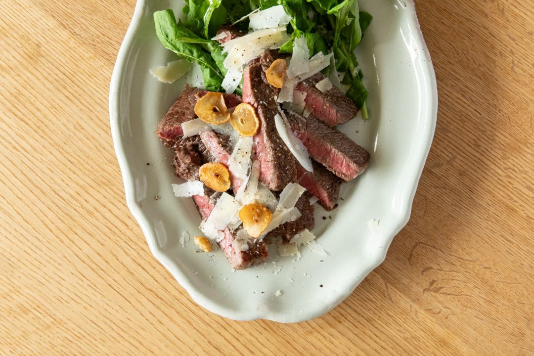 まずは牛肉から。焼いた牛肉を薄くスライスして提供されるイタリアの代表的なメニュー・タリアータです。塩とオリーブオイル、にんにくのシンプルな調味料でつくることで知られています。「牛肉はシンプルに焼くのが一番!」というワタナベさんが、ごちそうメニューと聞いて真っ先に思い浮かぶ肉料理のひとつだと言います。