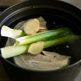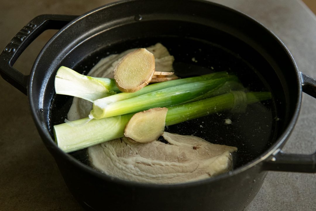 - 湯を捨てて豚肉を鍋に戻し、もう一度、肉にかぶるくらいの水を加えて中火にかける。沸騰したら約15分茹でてそのまま冷まし、鍋ごとラップをして冷蔵庫でひと晩おく。