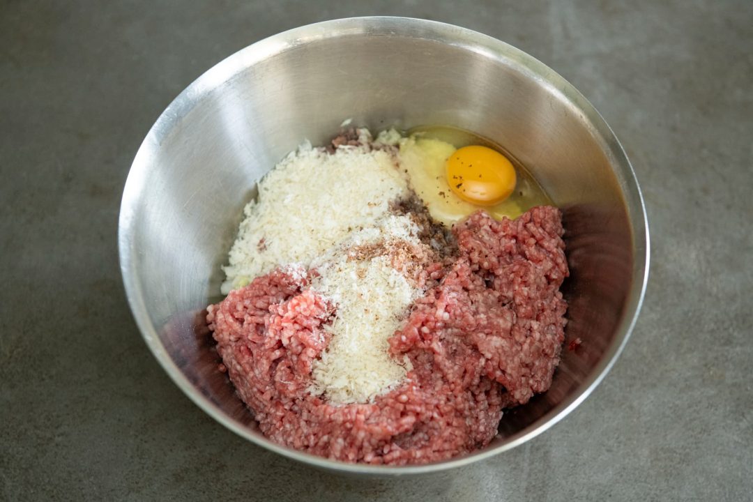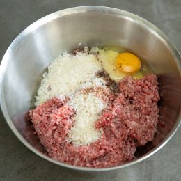 - 合挽肉に1.の半量、卵、パン粉、赤ワイン大さじ2、ナツメグパウダー、塩小さじ1/2、黒こしょうを加えてよく混ぜて15〜18等分に丸める。