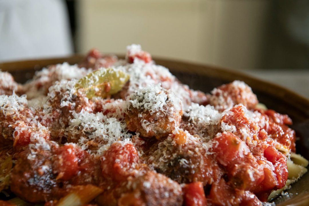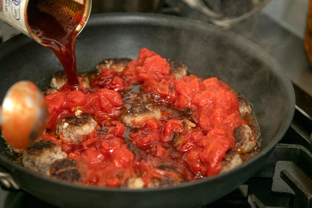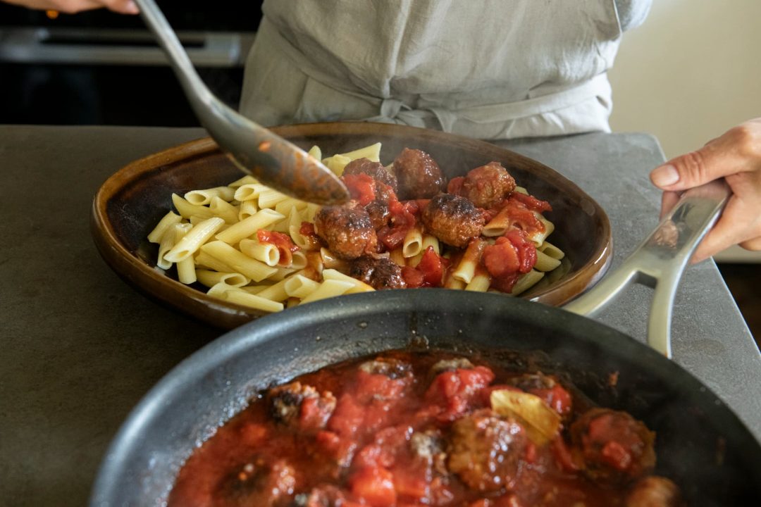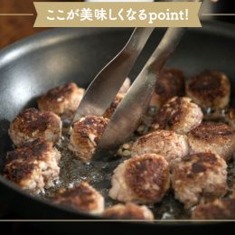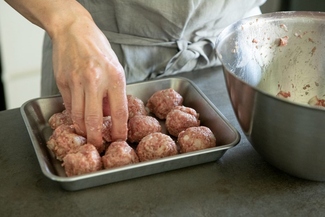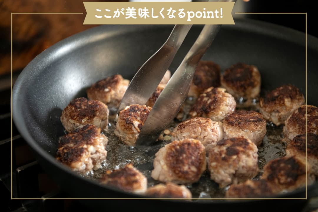 ミートボールをしっかり焼きつけて香ばしさを出すことがとっても大切。多めにパン粉を入れているので、焼き上がった後でもふわふわでやわらかく、噛み締めると肉汁がじゅわっと溢れ出すので、それも美味しさのひとつですね。
