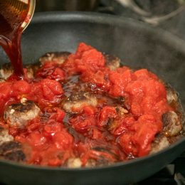 - トマトホール缶、ローリエ、残りの赤ワイン大さじ2、残りの塩小さじ1/2を加えて6〜7分煮る。