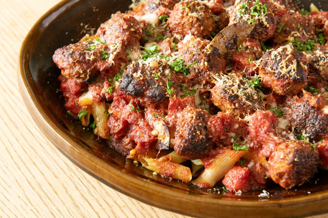 今回は、定番のホワイトソースではなく、トマトソースとペンネ、そしてふわふわ食感のやわらかいミートボールの黄金トリオでグラタンをつくります。表面に縦線が入っているペンネはソースと絡みやすいので、トマトソースとの相性は抜群ですよね。