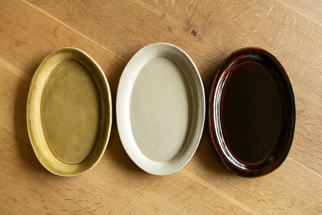 加藤さんとの打ち合わせから約2か月後、ワタナベさんの元に3種類のオーバル皿が届きました。黄瀬戸釉(きぜとゆう)・白釉(はくゆう)・飴釉(あめゆう)の3種(※)で、いずれも無地。黄瀬戸釉と白釉には、加藤さんが得意とする美しい貫入が入っています(飴釉は、釉薬の特徴から貫入は入れられない)。