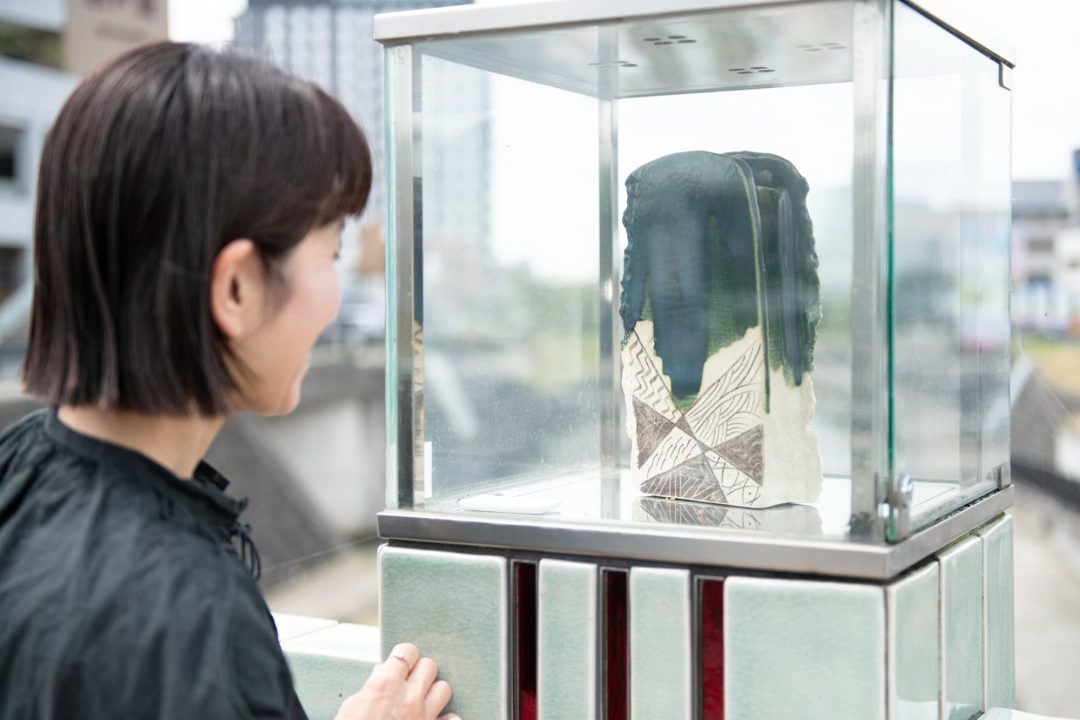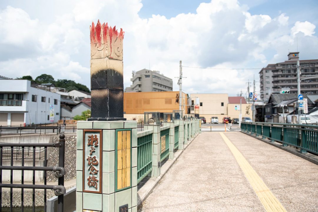 川の両端に陶器屋さんや和菓子屋さんが建ち並び、小高い山も見えてきます。瀬戸記念橋からの見晴らしが良かったので記念撮影。橋の上には、地元の陶芸家の方たちの作品がいくつか飾られていました。何気なく見ていると、なんと!これからワタナベさんが訪ねる予定の陶芸家・三峰園の加藤達伸さんの作品があったのです!「偶然とはいえ、驚きました!この作品もとても素敵!期待が高まります!」と少しはしゃいだ様子のワタナベさんでした。