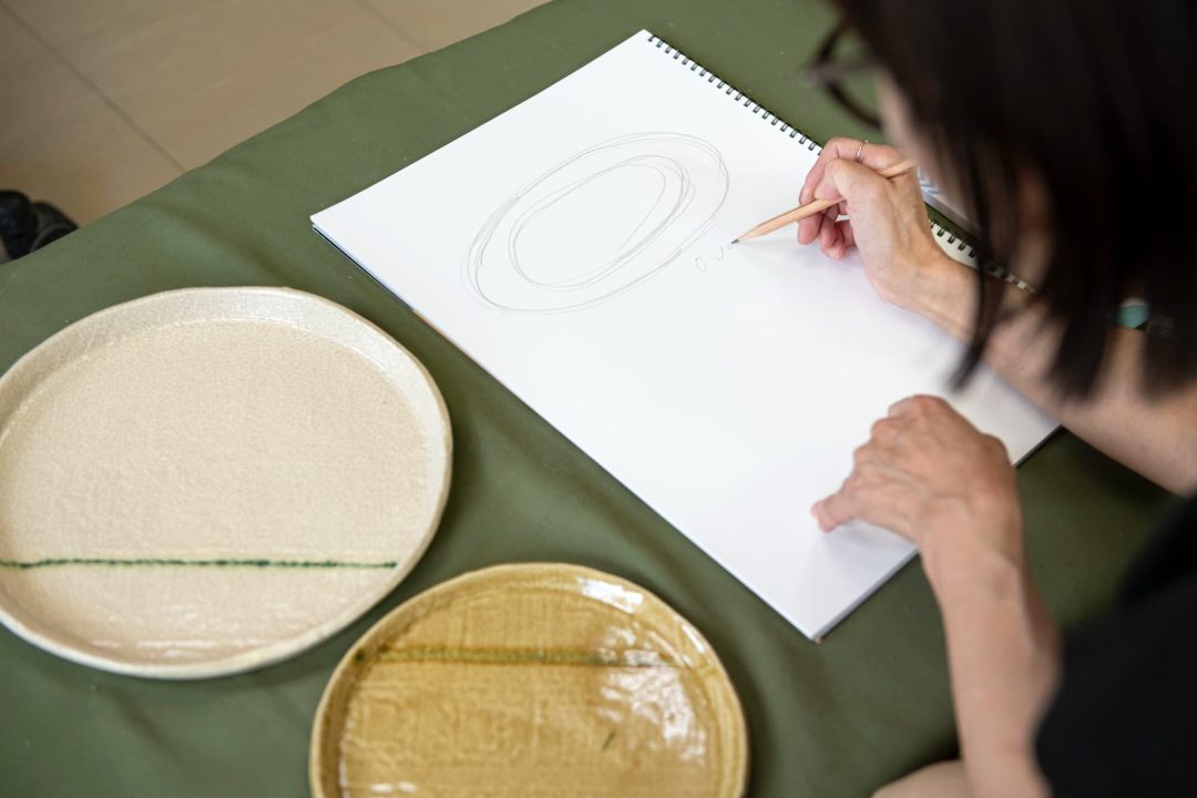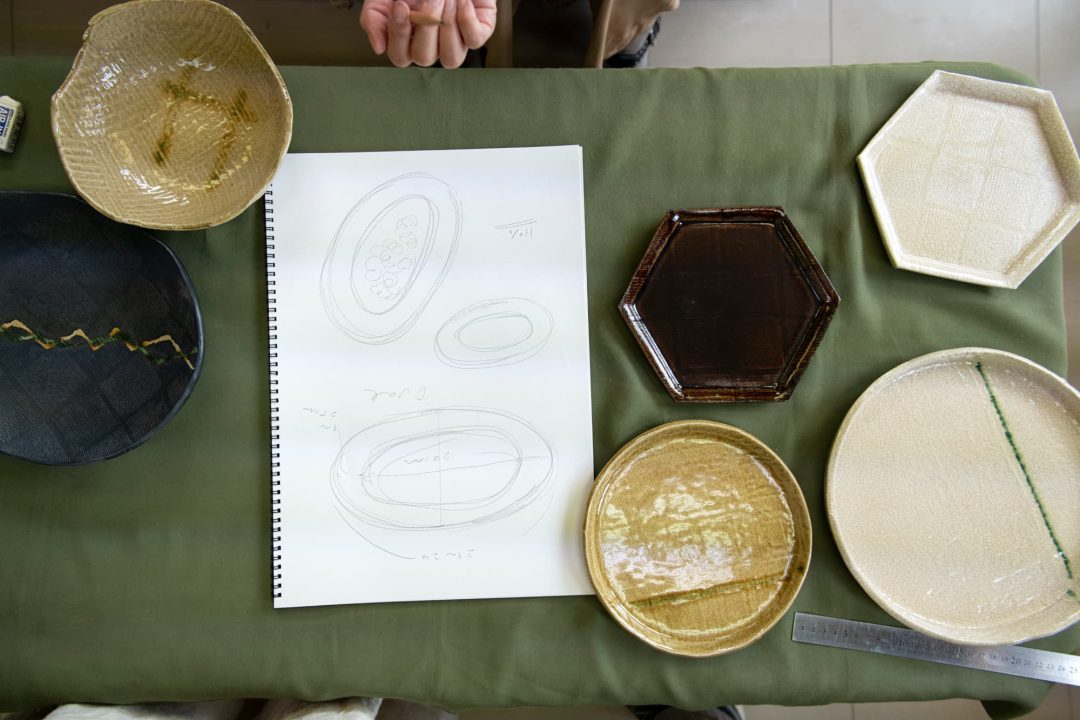加藤さんの器の特徴をさっそくつかんだワタナベさんは、イメージする器のスケッチに取り掛かります。