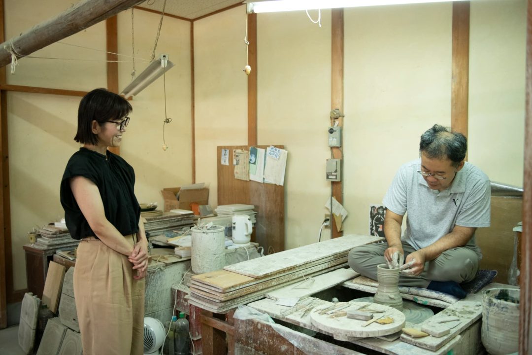 「つくり手の思いを感じられ、ぽってりしていて、シンプルな器が大好き」と語るワタナベさん。交流Styleの仕事を通じて中部地域に足を運ぶことが多いので、いつかこのエリアの陶芸産地に行ってみたいと思っていたそう。今回は、その希望が叶う取材となりました。
