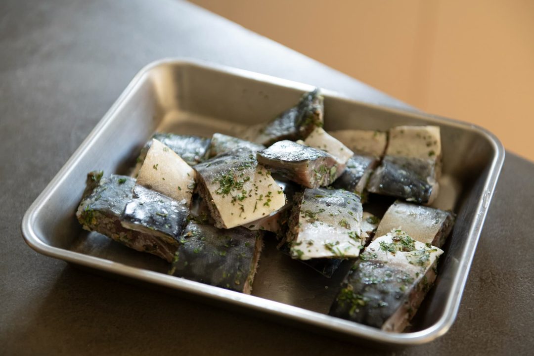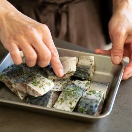- 塩サバは約2cm幅に切って表面の水気を拭き、にんにく、白ワインをなじませ、ドライハーブミックスを全体にまぶす。