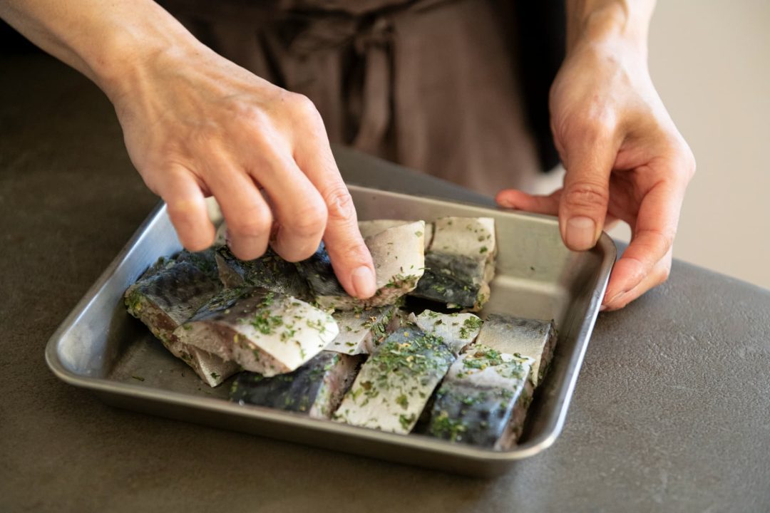 塩サバはそのまま冷凍してもいいのですが、洋風に風味づけをしてから冷凍すると、パンにも合うカフェメニューをつくることができます。