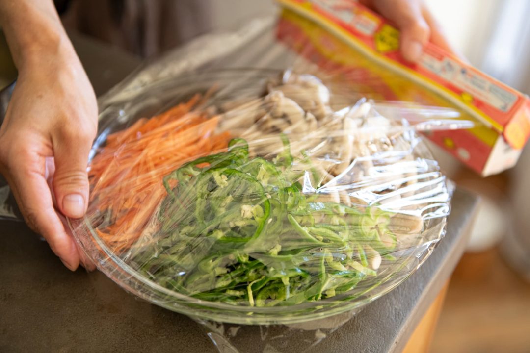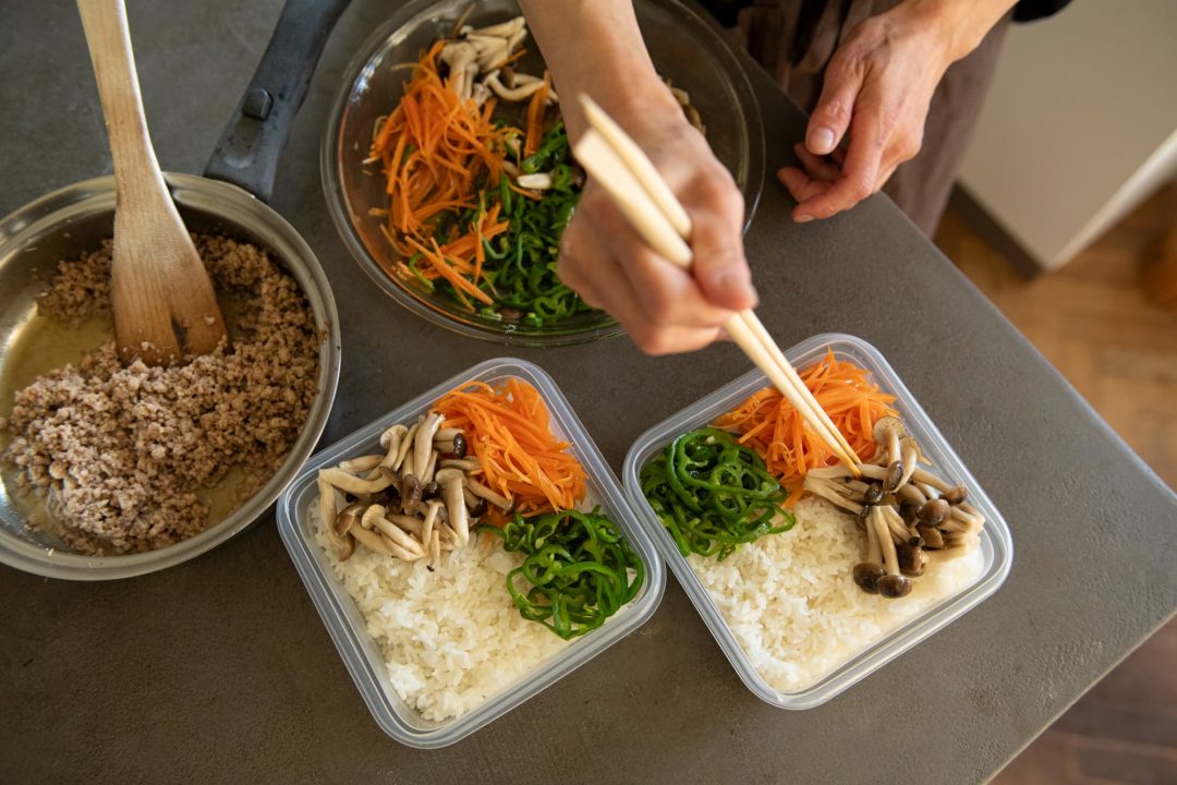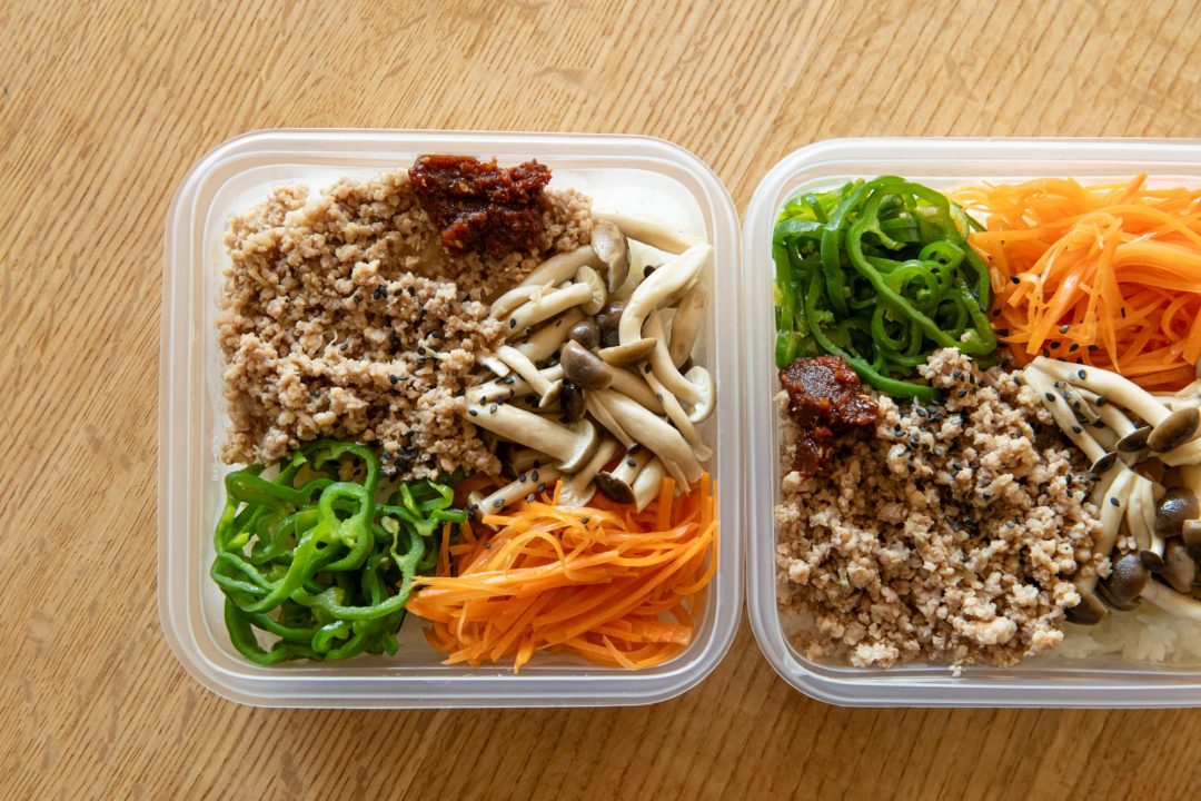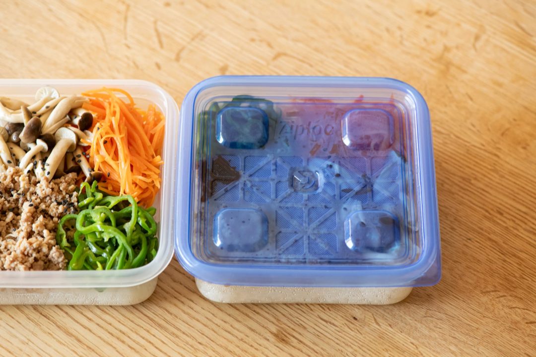 ビビンパのように汁気がないおかずは冷凍に向いています。汁気が多いおかずの場合は、コンテナの下にラップを敷いて、その上にごはんやおかずをのせましょう。