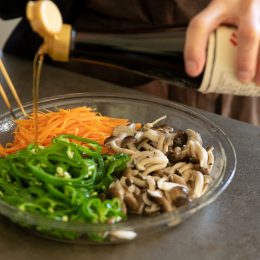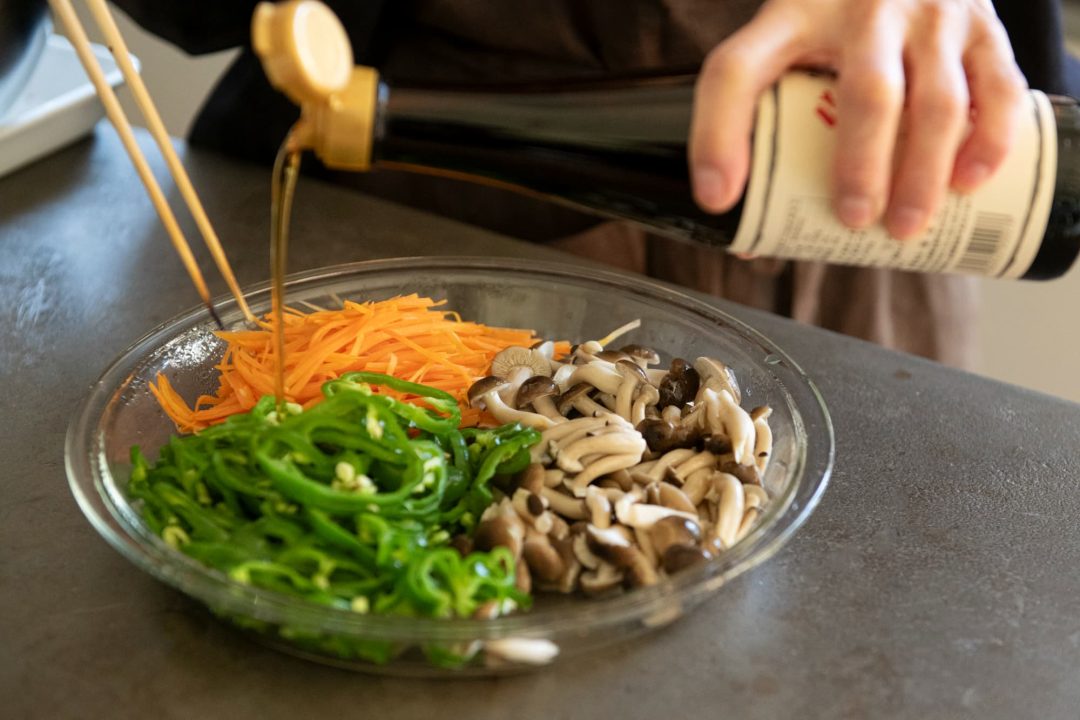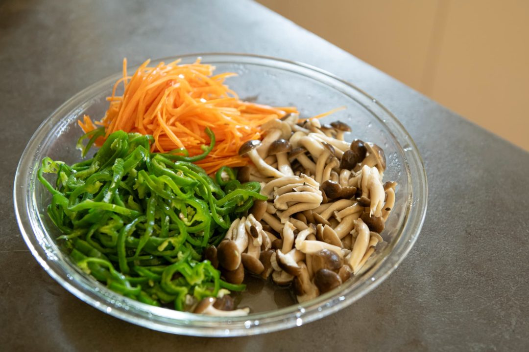 - にんじんは細切りに、ピーマンはヘタとタネをのぞいて約5mm幅の細切りに、しめじは石づきを取ってほぐす。