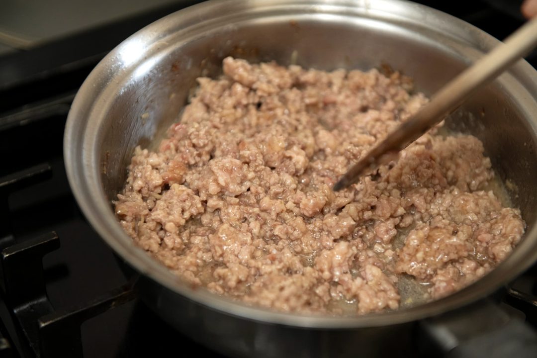 - フライパンにごま油を入れて中火で熱し、牛ひき肉を入れて色が変わるまで炒める。