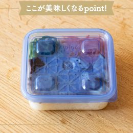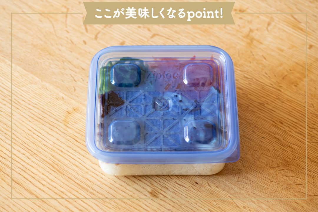 【Point!】あたたかいまま入れると冷凍庫内の温度が上がるため、必ず粗熱がとれてから蓋をして冷凍する。