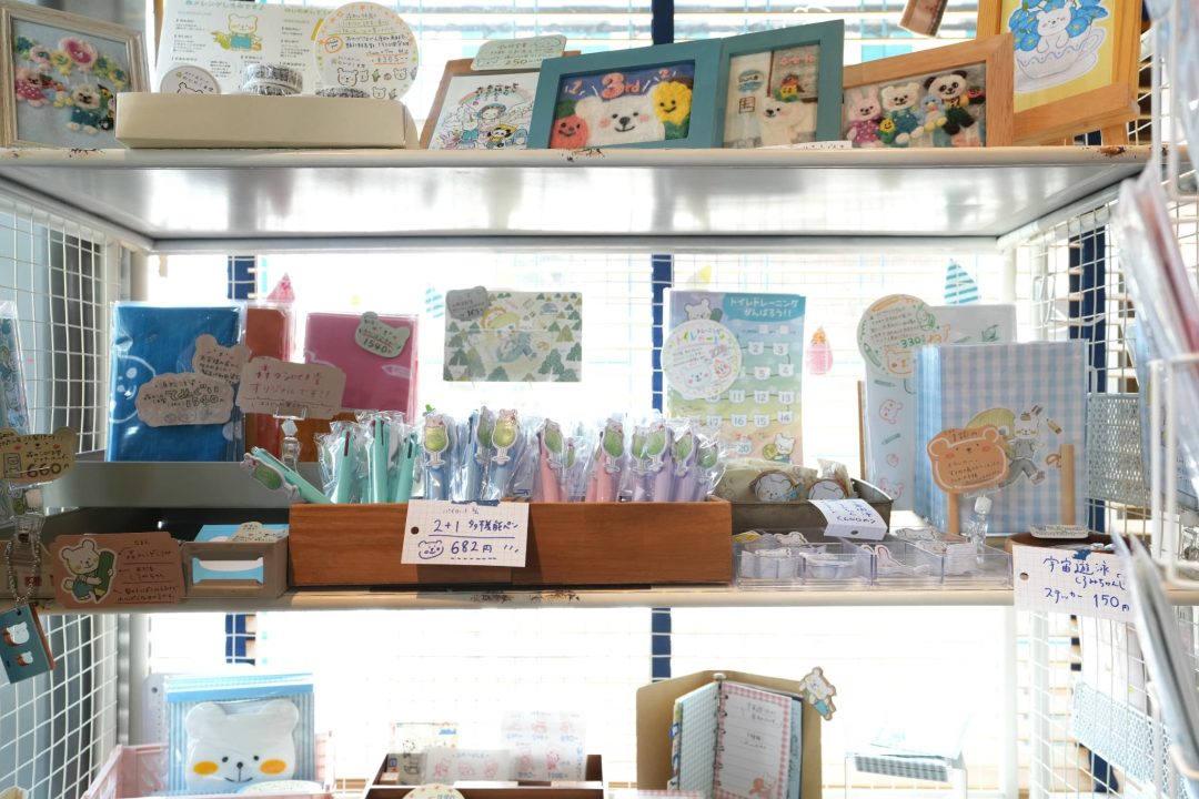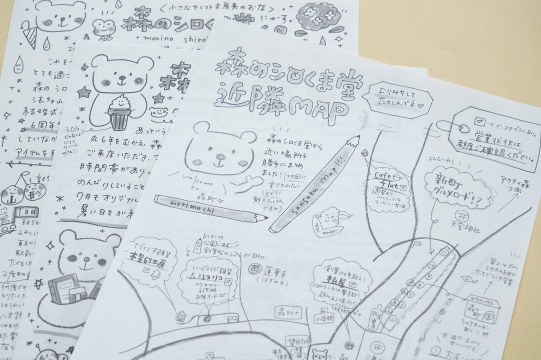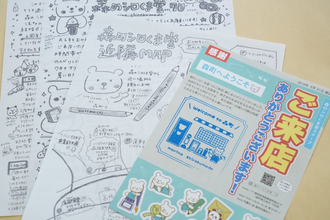 - 文具や雑貨などを扱うセレクト文具店として、2019年にオープン。コンセプトは「女性のための秘密の文具部屋」。約5坪の店内にはところ狭しと商品が並ぶ。商品はすべて店主の石川さんがセレクトしたもので、クマのオリジナルキャラクター「しろみちゃん」がデザインされたグッズなど、オリジナル商品のラインナップも豊富。店頭には周辺の森町エリアを紹介する石川さんの手書きマップを置き、地域の魅力発信にも取り組む。