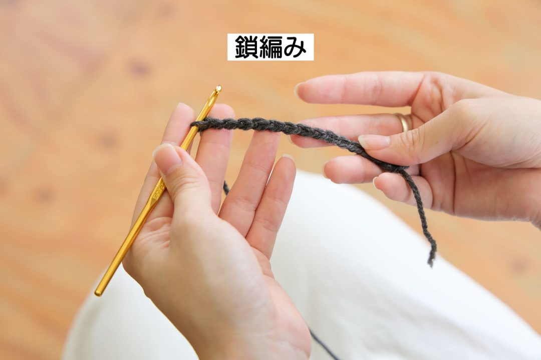 鎖編みは、編み物の土台となる編み方。写真上のように鎖状の編み目ができ、編み続けると、長いひも状になります。鎖編みを長く編んで、サコッシュのストラップなどにすることもできますよ。