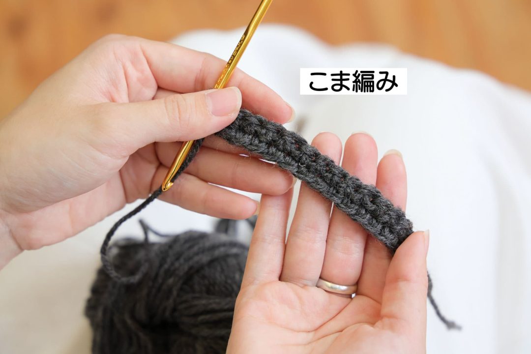 鎖編みを1目つくって立ち上げ、鎖編みの編み目にかぎ針を入れて糸をすくって編み、鎖編みの目をすべて編めば、こま編みが1段完成します(写真下)。こま編みは段の幅が狭く、目がきっちり詰まった仕上がりになります。2段目の編み始めも、1段目と同様に鎖編みを1目つくって立ち上げるところから始めます。
