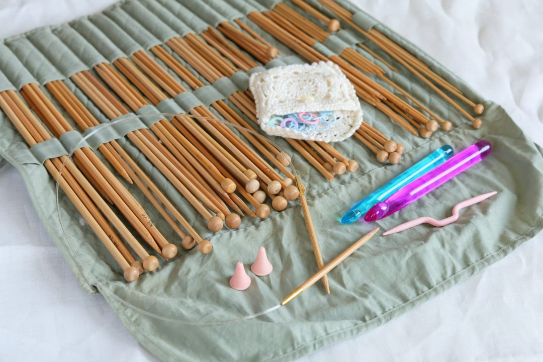 かぎ針の長さは、だいたいボールペンと同じくらい。かぎ針もとじ針も先端は丸く尖っていないので、例えばお菓子の空き缶や、布製のペンケースなども収納ケースとして活用できます。お気に入りの道具とケースを見つけて愛用することで、編む時間がもっと楽しくなるはずです。