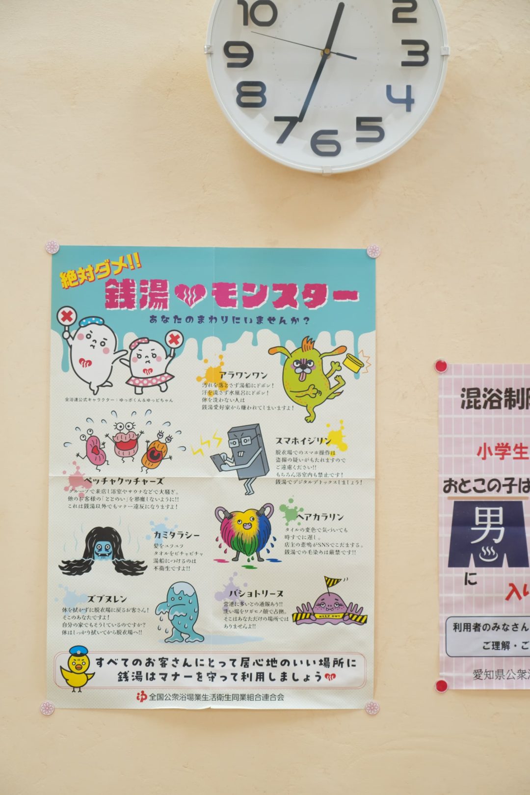 マナーと言っても、「銭湯はみんなで使うものなので、みんなが気持ちよく使えるように最低限のことは守ってね」といった単純なこと。例えば、入浴後に体をしっかり拭かず、脱衣所を濡らしてしまうお客さまがいらっしゃったとします。自宅だったら自分で床を拭くことになるので、そんなことはしないですよね?