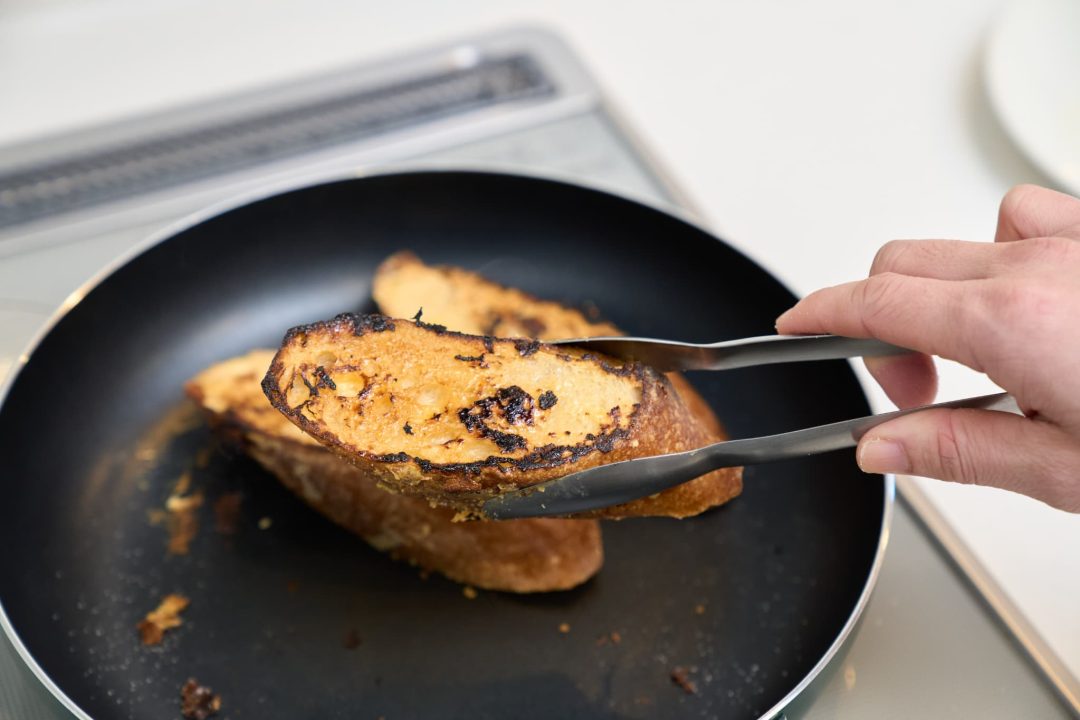5.片面だけにお好みでグラニュー糖(分量外)をふり、その面をフライパンで焼き付けて、焦げ目をつける。