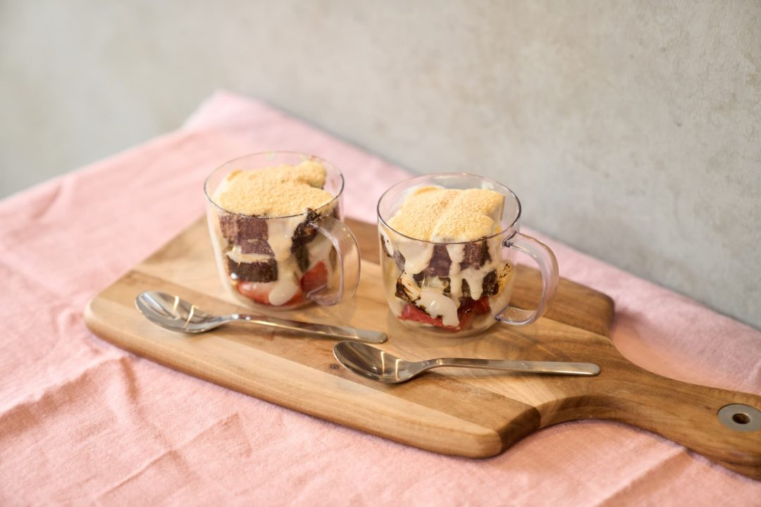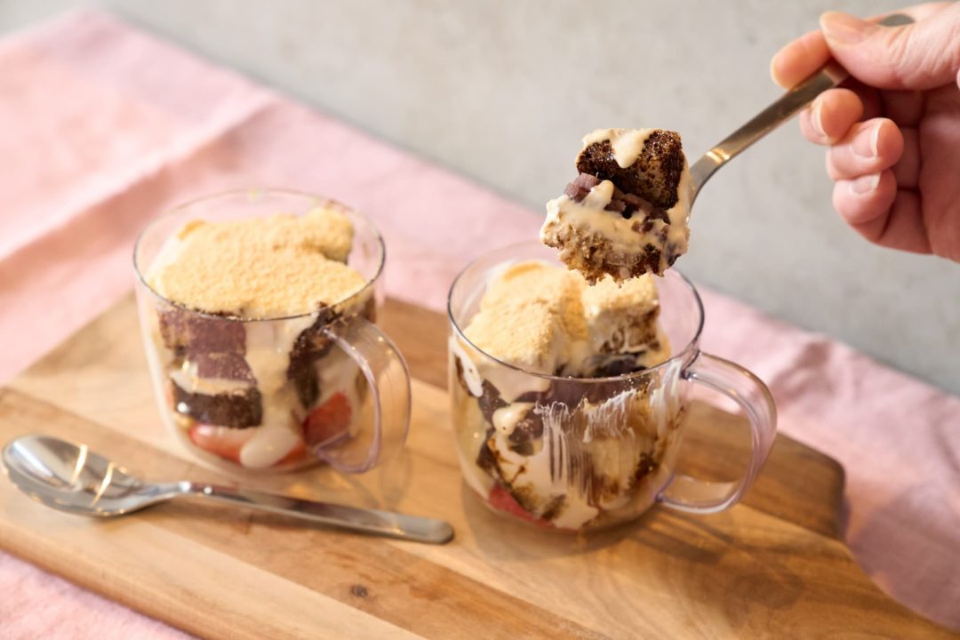 ティラミスは、スポンジケーキにコーヒーをしみこませてマスカルポーネチーズを何層かに重ね合わせてつくる王道のイタリアンデザート。自宅でつくろうと思うと材料を揃えるだけでも大変ですが、食パンとインスタントコーヒーを利用して、手に入りやすいクリームチーズで代用すれば簡単。あんこときなこを使って、和風なティラミスに仕上げました。