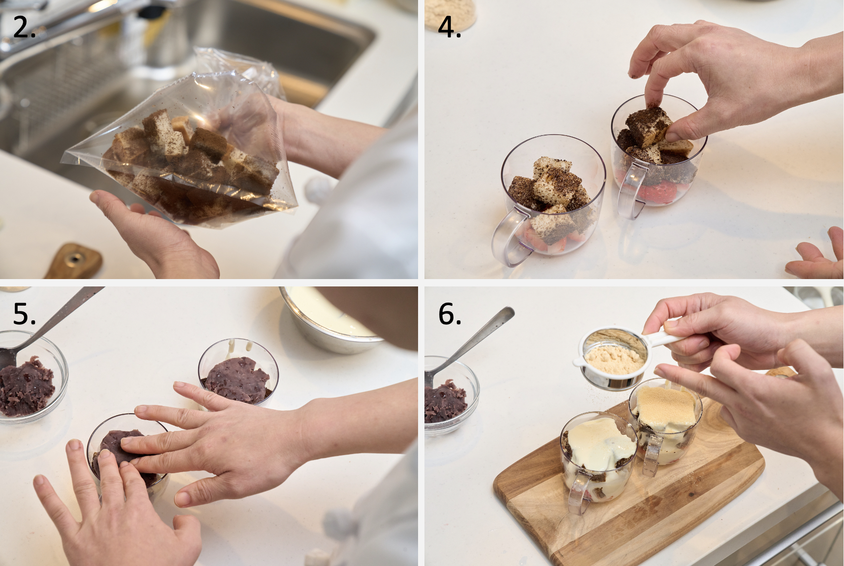 6.さらに2.を敷き、1.をかける。最後にきなこをかけて出来上がり。※きなこがない場合はインスタントコーヒーでもOK。