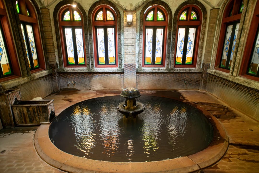 ローマの噴水を 模した洋風の浴堂でステンドグラスも見どころ。
