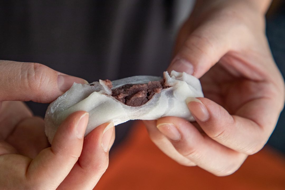 もち米を蒸し上げ、ついたばかりの生地でたっぷりと包むのは、北海道産小豆を上質糖で煮てじっくりと練りあげたこしあんです。やわらかな生地と丁寧につくられたキメの細かなこしあんとの相性抜群。生地には保存性が高まるといわれる砂糖が入っていないため、日持ちはしませんが、代わりにもち米の風味豊かな味わいを感じられます。賞味期限は、つくった日の翌日まで。もし翌日になって表面が硬くなっていたら、トースターなどで軽く温めるか、フライパンでさっと焼くと、また違った美味しさを楽しめます。