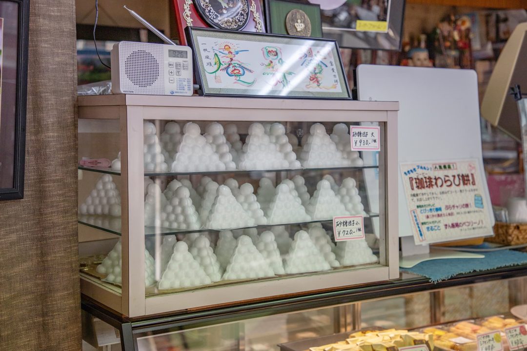 - 市街地を抜けて、みかん畑ののどかな風景を過ぎた街道沿いにある店。すぐ近くには小学校があり、子どもたちの通学路になっている。幅広い層のお客さまが代わる代わるやってきては、ちいちい餅や季節のお菓子を買い求めていく、地域に愛される和菓子屋だ。