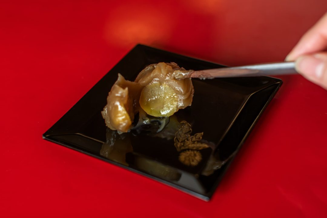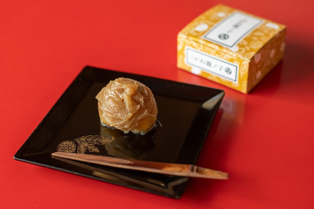 今回紹介するのは「くがね鹿ノ子」。とれたての大粒の栗を丁寧に煮た蜜煮が、栗と砂糖だけで練った栗あんに包まれているお菓子です。