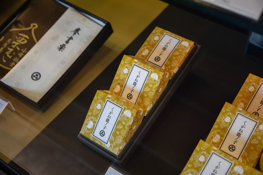 商品名の「くがね」とは「金」の古語における読みで、黄金を意味しているのだとか。小布施堂の栗鹿ノ子には、くがね鹿ノ子のほかに、同店伝統の濃厚な「栗鹿ノ子」、なめらかでみずみずしい「まろやかのこ」の3種類があります。くがね鹿ノ子を金、栗鹿ノ子を銀、まろやかのこを銅と見立てて、金銀銅の3つの鹿ノ子をセットにした「かのこ三昧(さんみ)」という食べ比べセットも販売しています。甘さや食感が異なる3種類の鹿ノ子があるとは、さすがに栗菓子の聖地・小布施町を代表する和菓子店です。